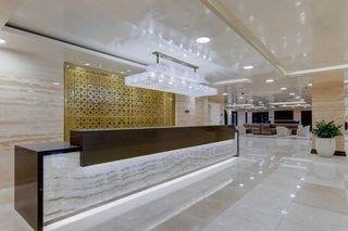 - Expansive lobby featuring a wall fountain, illuminated art installations, a coffee bar, waiting areas, and an adjoining lounge.