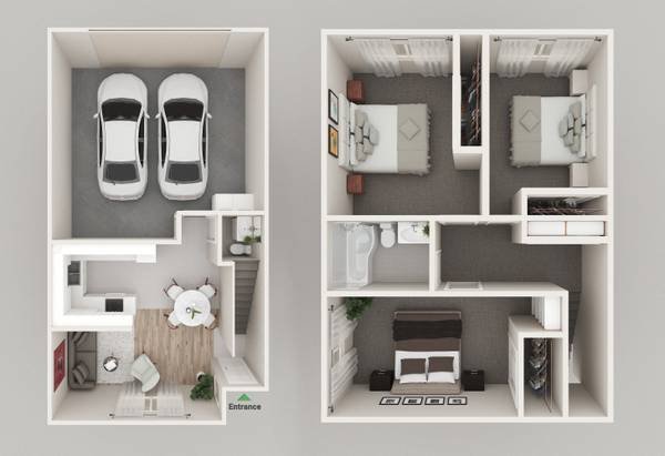Our premium apartments feature elevated ceilings that enhance the sense of space, modern kitchens equipped for cooking, generous storage closets, and convenient two-car garages. A selection of layouts ensures you will find a space that suits your individual taste.