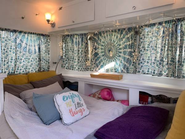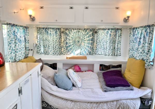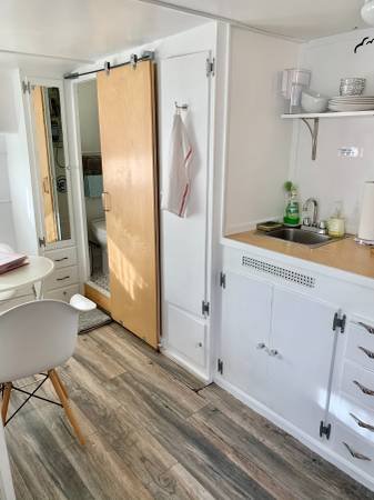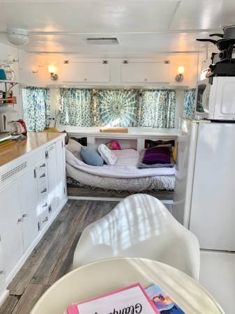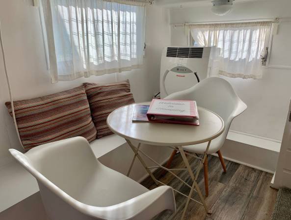 The unit is a fully renovated 1958 camper that functions as a standard home, complete with full utility hookups. It is entirely self-contained and comes fully furnished. Amenities include a standard toilet and shower, a comfortable bed, a table and chairs, and a built-in seating bench. The kitchen is equipped with a toaster oven, coffee maker, cooktop, pots and pans, a bread toaster, a microwave, a refrigerator with freezer, and all essential kitchen utensils. Bed linens, towels, blankets, rugs, and cleaning supplies are also provided.