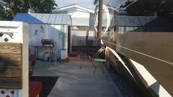 This space boasts the best location in the park, situated directly across from the clubhouse and the pool area, which features mineral hot water and jacuzzis. The lot includes pavers and a concrete patio. An 8.5\' by 9.5\' shed is provided, complete with electricity, a refrigerator, a large workbench with a vice, and a sound system. A portable privacy fence on wheels is also included.