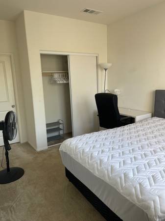 This listing is for a furnished bedroom with a private en-suite bathroom in an owner-occupied home. The owner is an engineer employed at Edwards. The property is a newly constructed home built in 2018, encompassing 3100 square feet with five bedrooms and four bathrooms, located in the West Lancaster area.
