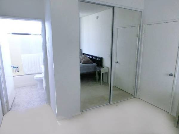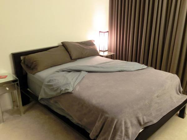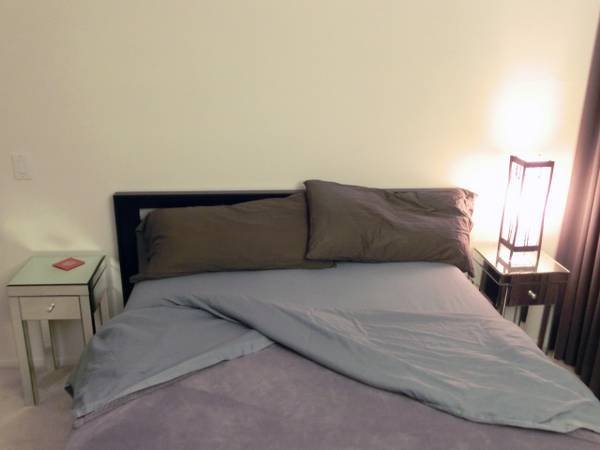 I am offering a private master bedroom with an ensuite bathroom for rent. The space is tidy and receives ample natural light. It is furnished with a queen-sized bed, a nightstand, and a desk. The closet features built-in shelving and hanging rods for organization.