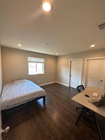 The Room: This is the master bedroom in a shared house occupied by four residents. It is a quiet space and comes fully furnished. Included amenities are a bed, a desk with a chair, a mini refrigerator, a private en-suite bathroom, and a spacious closet.