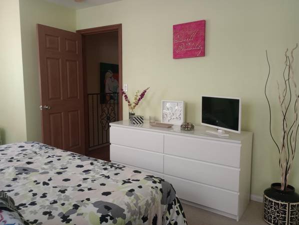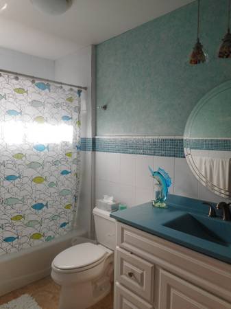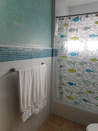 Occupants of the two private bedrooms will share the white and turquoise bathroom shown in the photograph. You are also welcome to use the downstairs living and dining areas, the kitchen for light cooking, and the upstairs laundry facilities. Each bedroom is equipped with a ceiling light and fan fixture. The entire townhouse benefits from central air conditioning and heating. Bedrooms feature berber-style carpeting, while the bathrooms, entryway, and kitchens have travertine flooring. All other floors and stairs are finished in redwood.