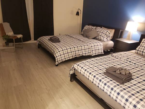The space offers a hotel-style atmosphere with flexible sleeping arrangements, available as a single Queen bed, two Queen beds, or three Queen beds configuration.