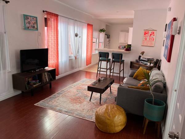The apartment itself is roomy and ideally suited for either a couple or an individual. It is offered furnished and benefits from ample natural illumination. The unit includes a separate shower and bathtub, a bar counter, and standard amenities such as high-speed WiFi, streaming service access, reliable hot water, air conditioning, a microwave, a stove, a refrigerator, and dishware.